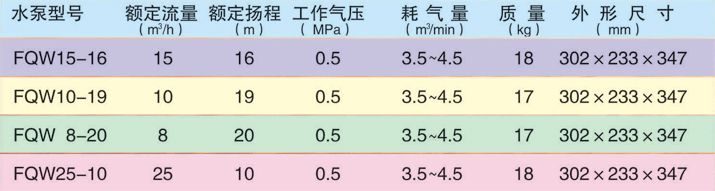 特點: FQW(原BQF型)礦用風動潛水泵,該泵以壓縮空氣為動力,采用離心泵結構形式。具有體積小,重量輕,結構簡單,安裝維修方便,在含有瓦斯與煤塵的礦井中使用安全可靠,是一種先進的風動排水設備。